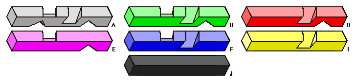 In this solution the pieces A, B, D, E, F, I an J are used. In